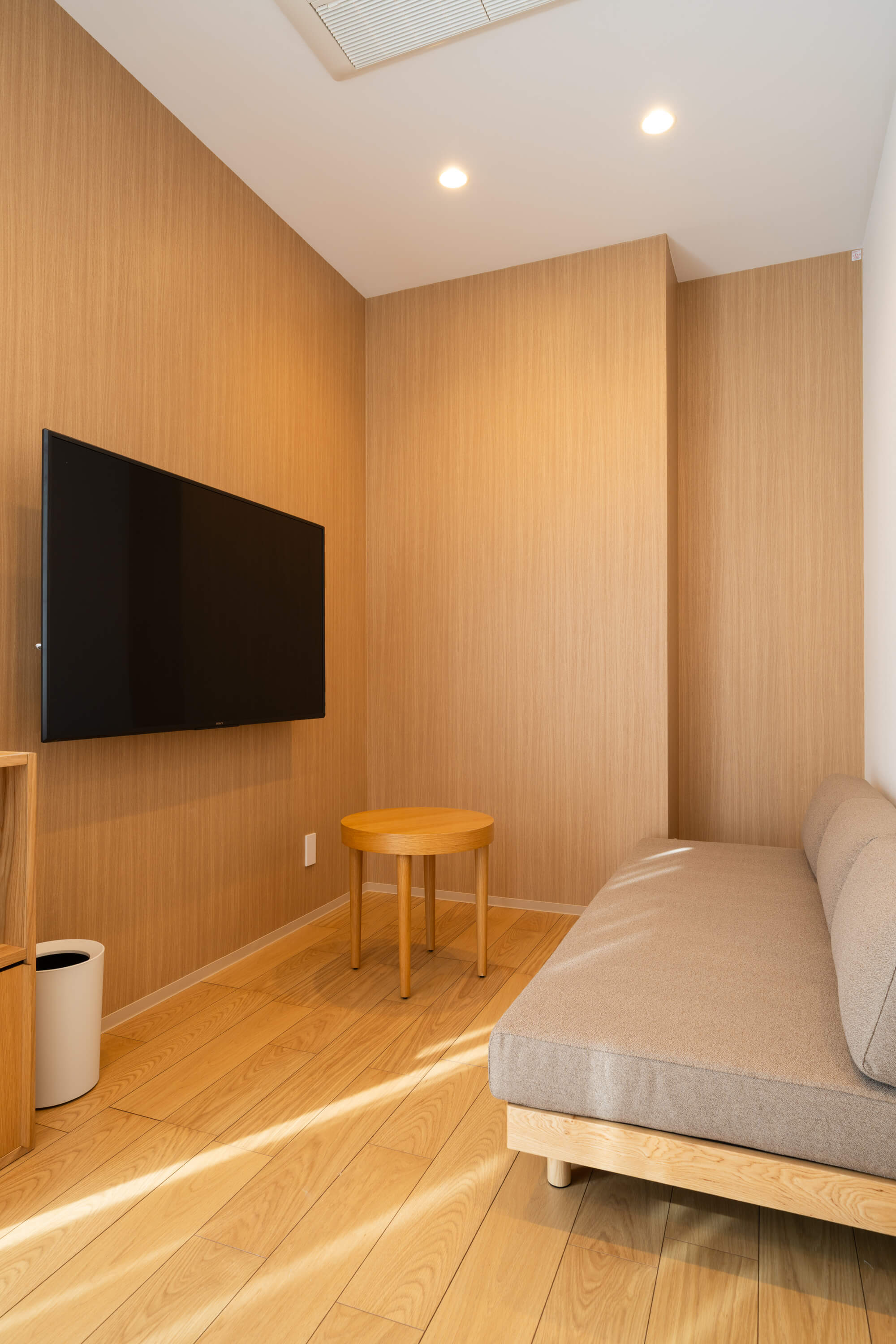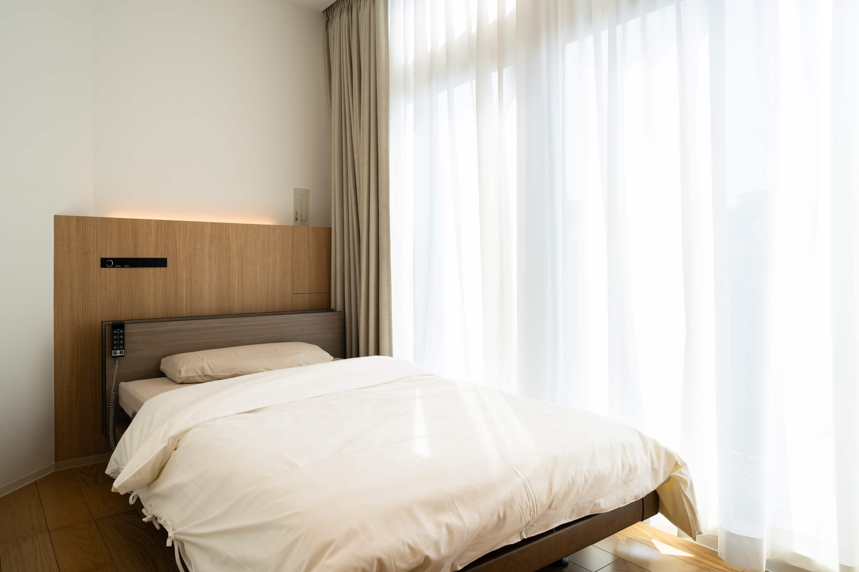 産後の身体をやさしく支えるパラマウントベッドを導入。小さなリビンススペースも備えています。